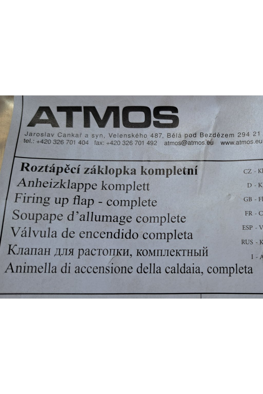 ATMOS roztápěcí záklopka kompletní